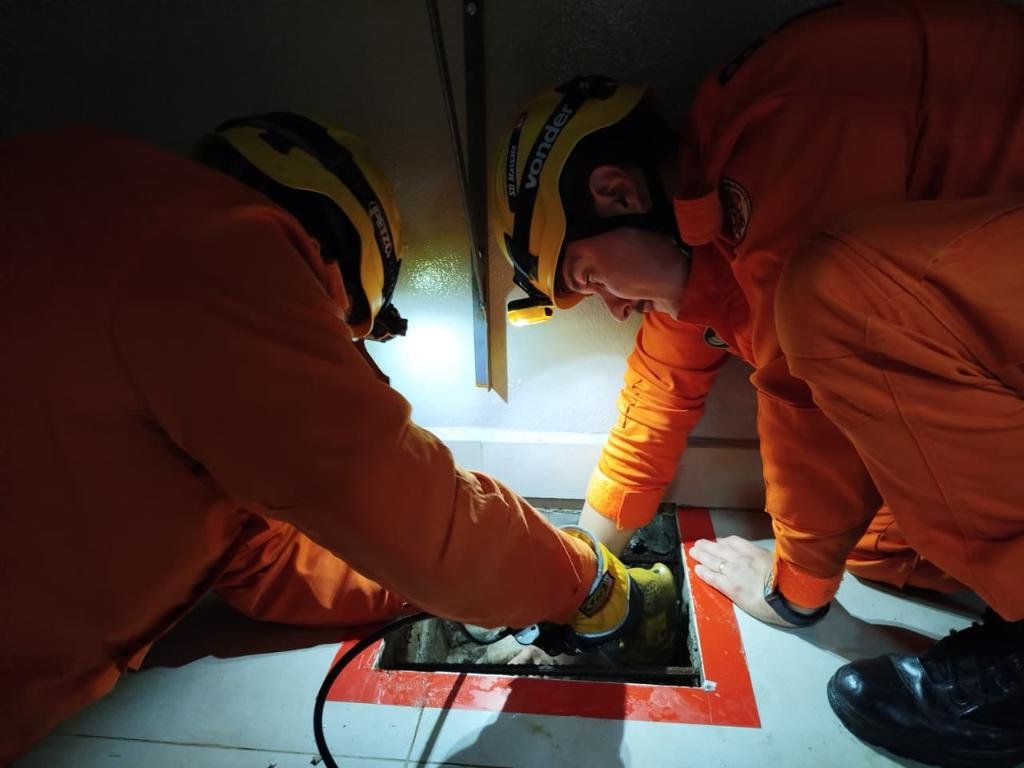 No local, os bombeiros encontraram o animal preso na galeria pluvial, parcialmente soterrado no concreto e com parte do corpo submersa. Para realizar o resgate, foi necessário quebrar o concreto de forma lenta e cuidadosa, utilizando uma furadeira elétrica e uma talhadeira manual, até enfraquecer a estrutura e possibilitar a retirada do gato.